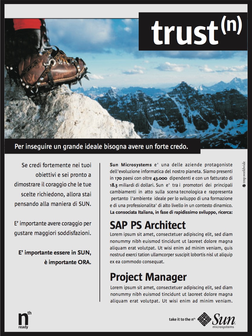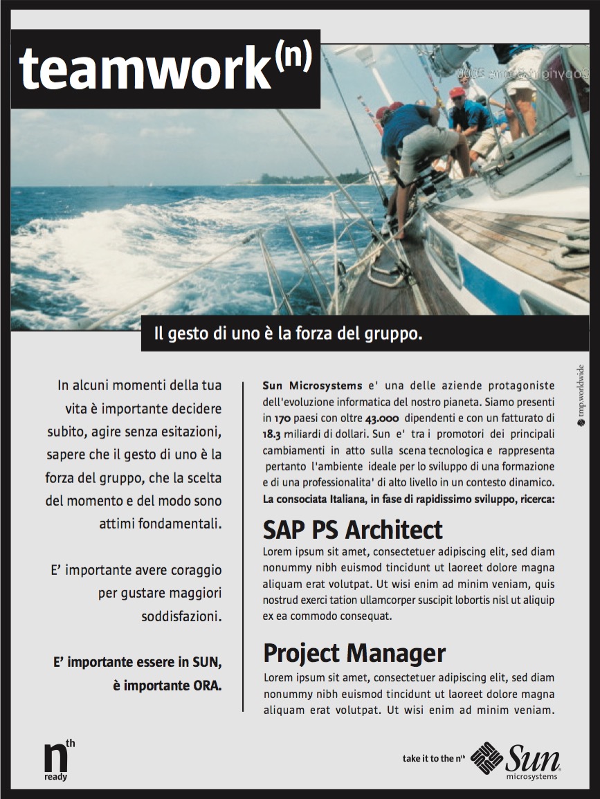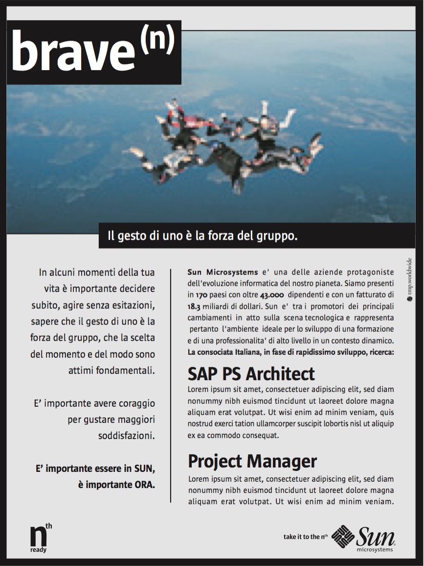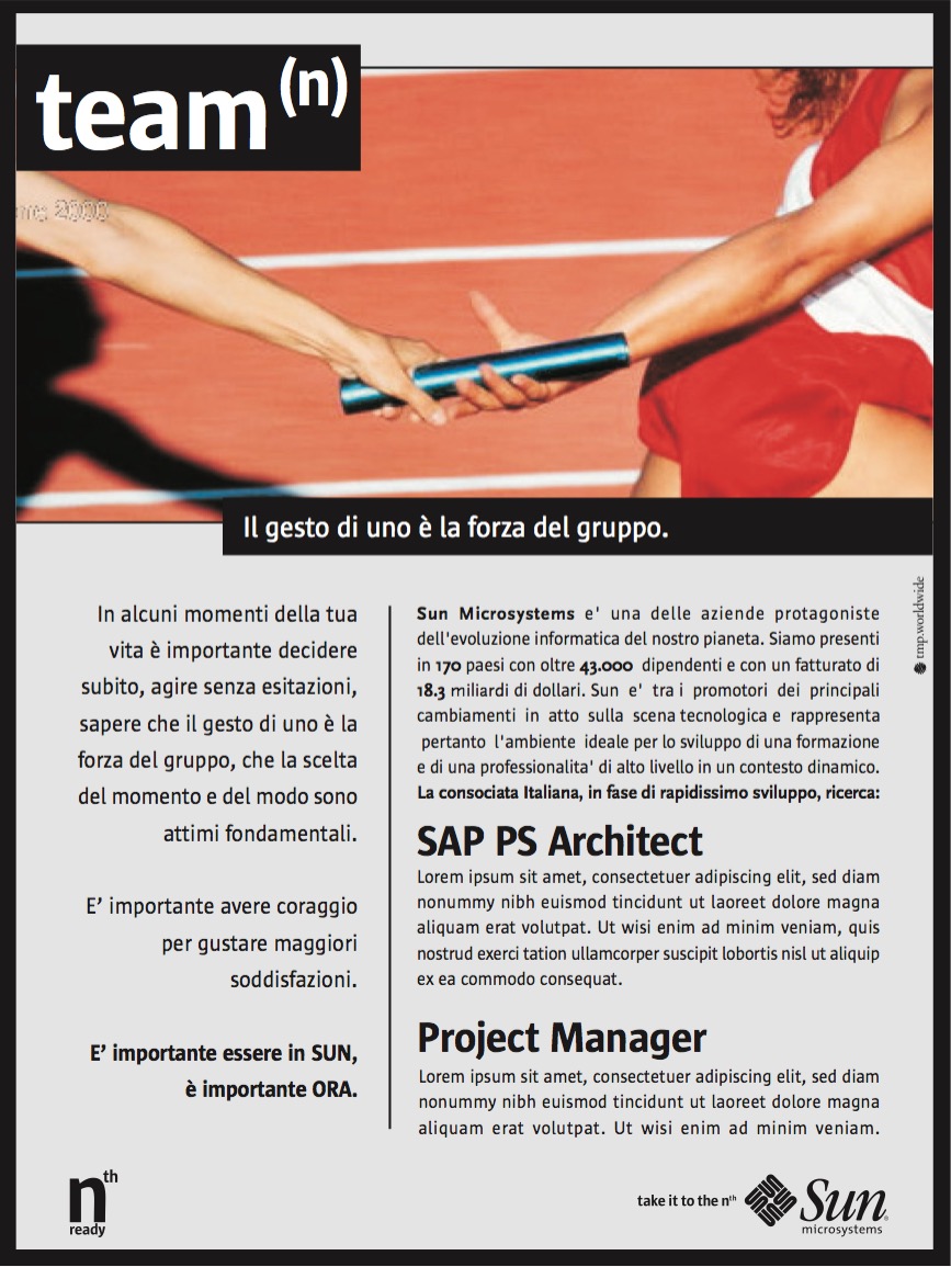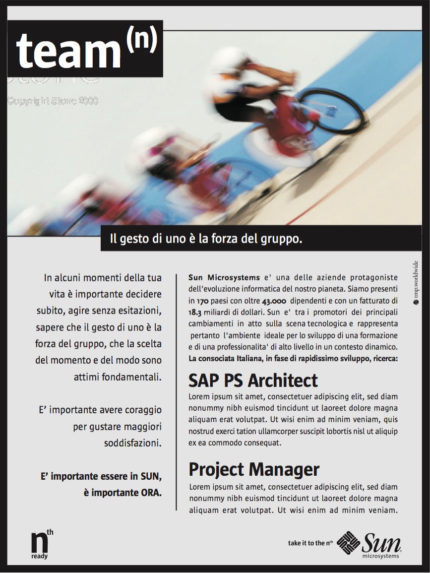 Sun Microsystems (oggi Oracle America, Inc.) è stata un'azienda della Silicon Valley produttrice di software e semiconduttori nota, tra le altre cose, per avere prodotto il linguaggio di programmazione Java. A (9)lab, tramite la collaborazione con TMP Worldwide di Bergamo, è stato affidato l'incarico di produrre una campagna istituzionale da inserire su testate nazionali nel settore della ricerca del personale, di creare nuovi headline, di studiare immagine e copy per annunci di ricerca. La ricerca e lo sviluppo del nuovo messaggio hanno portato alla creazione della campagna "take it to the N", ennesima potenza di ogni possibilità.